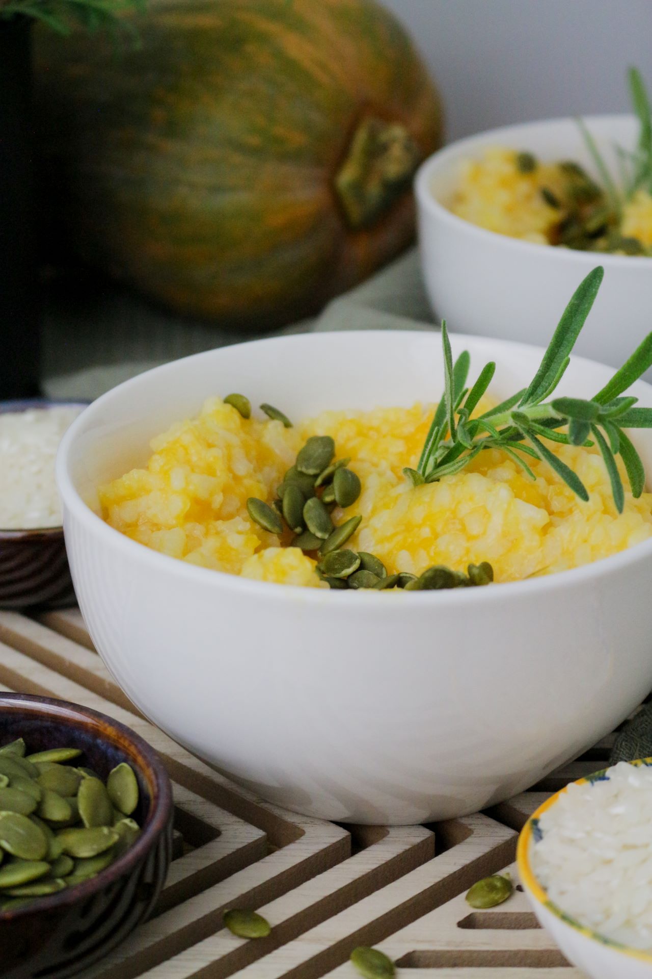 Then place the braised onion, garlic and pumpkin in the bottom of the ovenproof dish (or a dish with a lid). Add the risotto rice, chopped sage and rosemary, lemon juice and vegetable stock. Season with salt. Cover the casserole (or oven dish) with a lid and place in a preheated oven. Bake the risotto for about 40-50 minutes, stirring occasionally. Add more vegetable stock or water as needed to maintain the risotto’s creamy consistency.