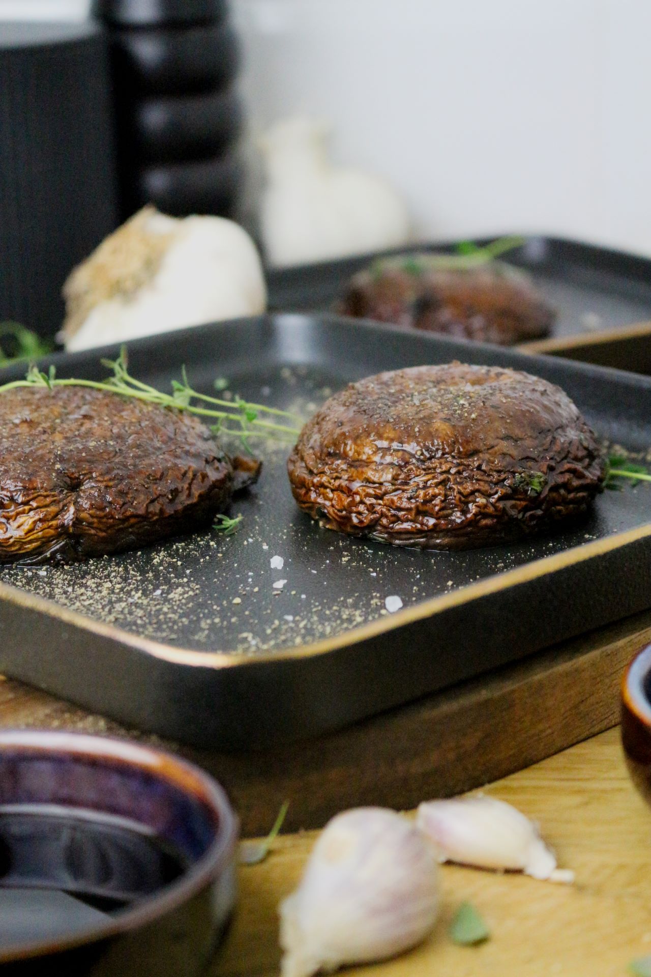 Clean the portobello mushrooms and remove the legs. In a bowl, mix together the coconut-amino sauce, olive oil, chopped garlic, rosemary and thyme and coat both sides of the mushrooms with the marinade. Leave to season for at least 15-20 minutes.