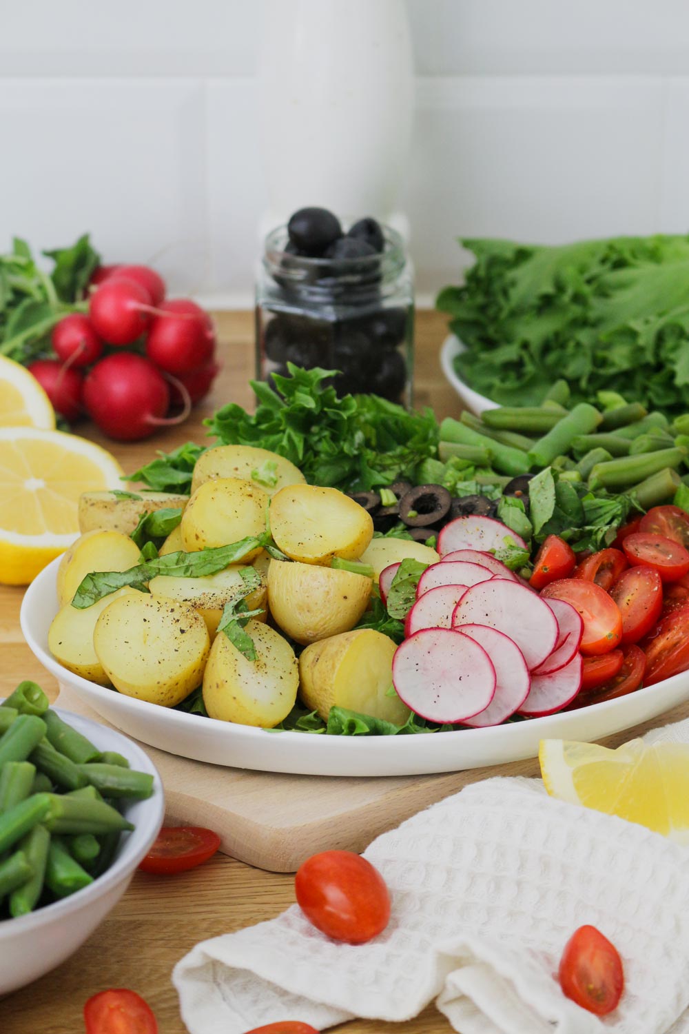 Place the chopped lettuce in the bottom of a plate or bowl and top with sliced olives, halved cherry tomatoes, steamed potato wedges, steamed beans, radish wedges and chopped basil.