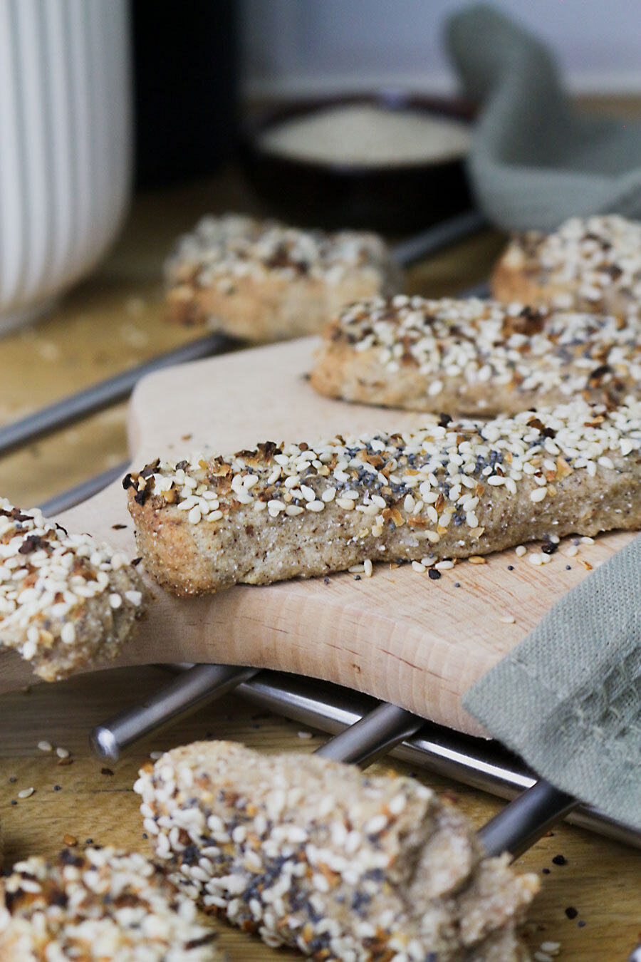 First mix the flaxseed meal and water in a small bowl and set aside for a moment. Then, in a larger bowl, mix together all the other dry ingredients. Add the coconut oil, maple syrup, water and the flaxseed meal mixture that was on hold to the dry ingredients. Knead the dough between your hands until you have a dough that sticks together. Then place the dough on a baking tray or kitchen surface covered with baking paper and place another sheet of baking paper on top. Roll the dough between the baking paper until it is about ½ cm thick. Then cut the dough into rectangles of more or less the same size and shape each rectangle into a ‘baguette’ between your hands. Bring the water to the boil in a saucepan (add 1-2 teaspoons of bicarbonate of soda if you like, this will keep the pastry softer) and place the ‘batons’ in the boiling water. Boil for about 1-2 minutes, then place on a baking tray lined with baking paper and cover with the seed mixture. Bake in a 200°C oven for 18-20 minutes and enjoy!