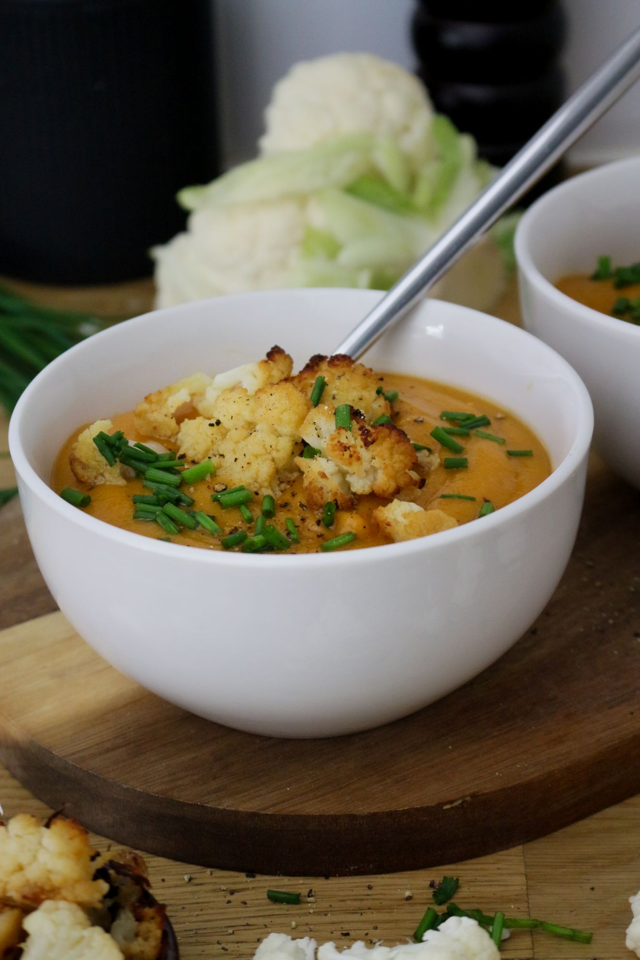 Serve the soup with roasted cauliflower sprigs and chopped chives.