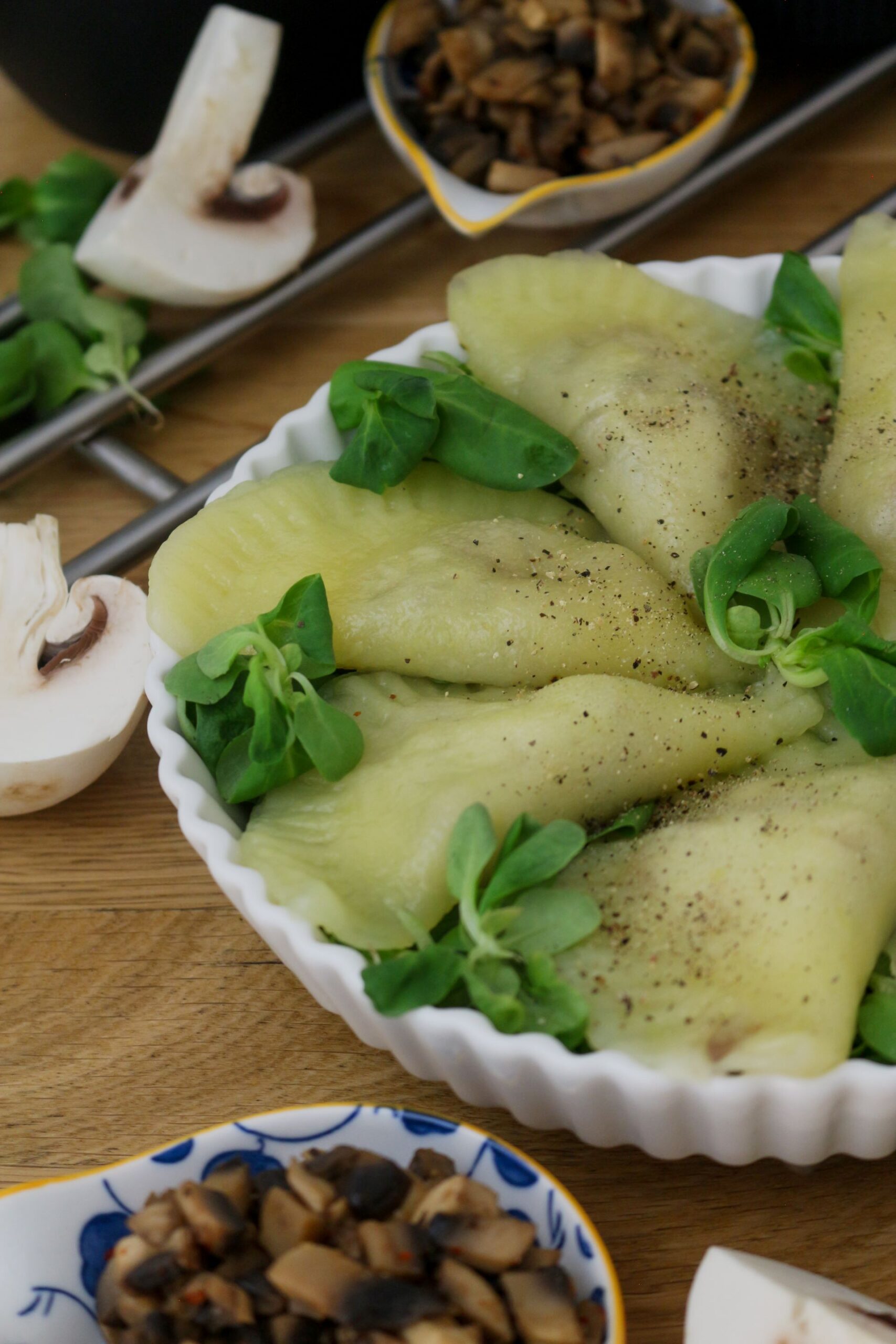 Place a teaspoon or so of the mushroom mixture on one side of each dough sheet, place one side on top of the other and press down with your fingers – you should get a shape resembling a chebrek or a half moon. If you like, you can also carefully run a fork over the pinched edge to get a nice jagged edge. NB. Make sure you don’t knead the dough too thin and that when you fold it, you leave a little space around the edges so that the filling doesn’t start to squeeze out. It’s important to keep this in mind so that the dumplings stay together nicely as they cook.