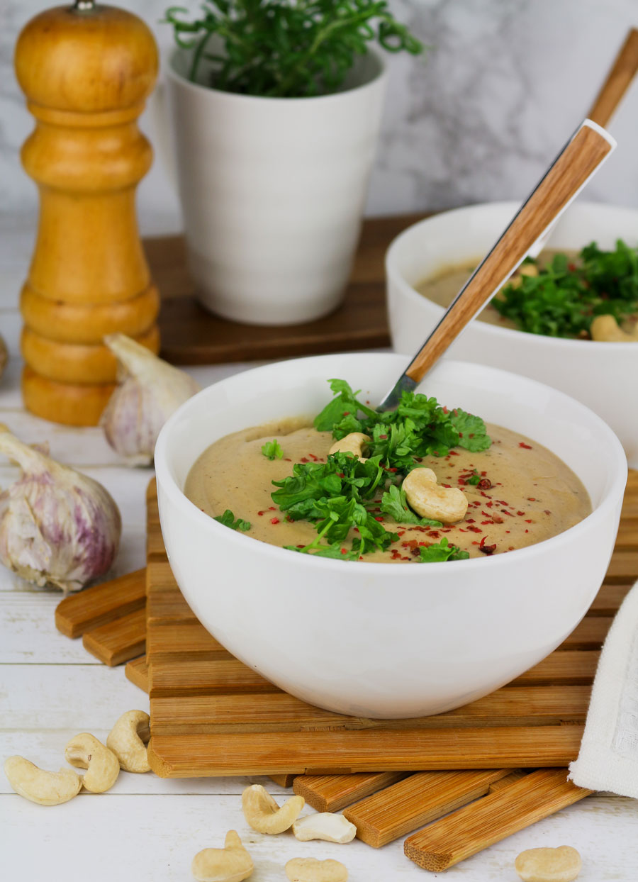Remove the vegetables from the oven and place in a large soup pot (leave a few cauliflower sprigs for serving) with the vegetable stock, beans and seasonings. Stir and bring to the boil. Simmer the vegetables over a low to medium heat for 15-20 minutes until the cauliflower is completely tender and the mixture is broken down. Then turn off the heat and pour the mixture into a blender with the lemon juice and a pinch of salt. Process until creamy and silky. Then pour half of the mixture back into the pot and add the soaked Indian nuts to the remaining mixture in the blender. Blend until smooth. Pour the mixture into the pot with the rest of the soup and blend thoroughly.